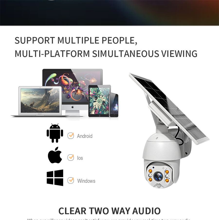 3. 2-Way Audio aniq PIR harakatni aniqlash ---4g tashqi suv o‘tkazmaydigan quyosh kamerasi o‘rnatilgan karnay va mikrofon sizga kuzatuv zonasida bo‘lgan odamlar bilan masofadan turib suhbatlashish imkonini beradi. 4g tashqi suv o'tkazmaydigan Quyosh kamerasi yuqori sezgir raqamli PIR harakat sensori va radar detektorini qabul qiladi, odamlar harakati aniqlangandan keyin telefoningizga ogohlantirishlar yuboradi. aniq piksel tahlili texnologiyasi bilan yomg'ir va hasharotlar keltirib chiqaradigan noto'g'ri signallarni maksimal darajada kamaytiradi.